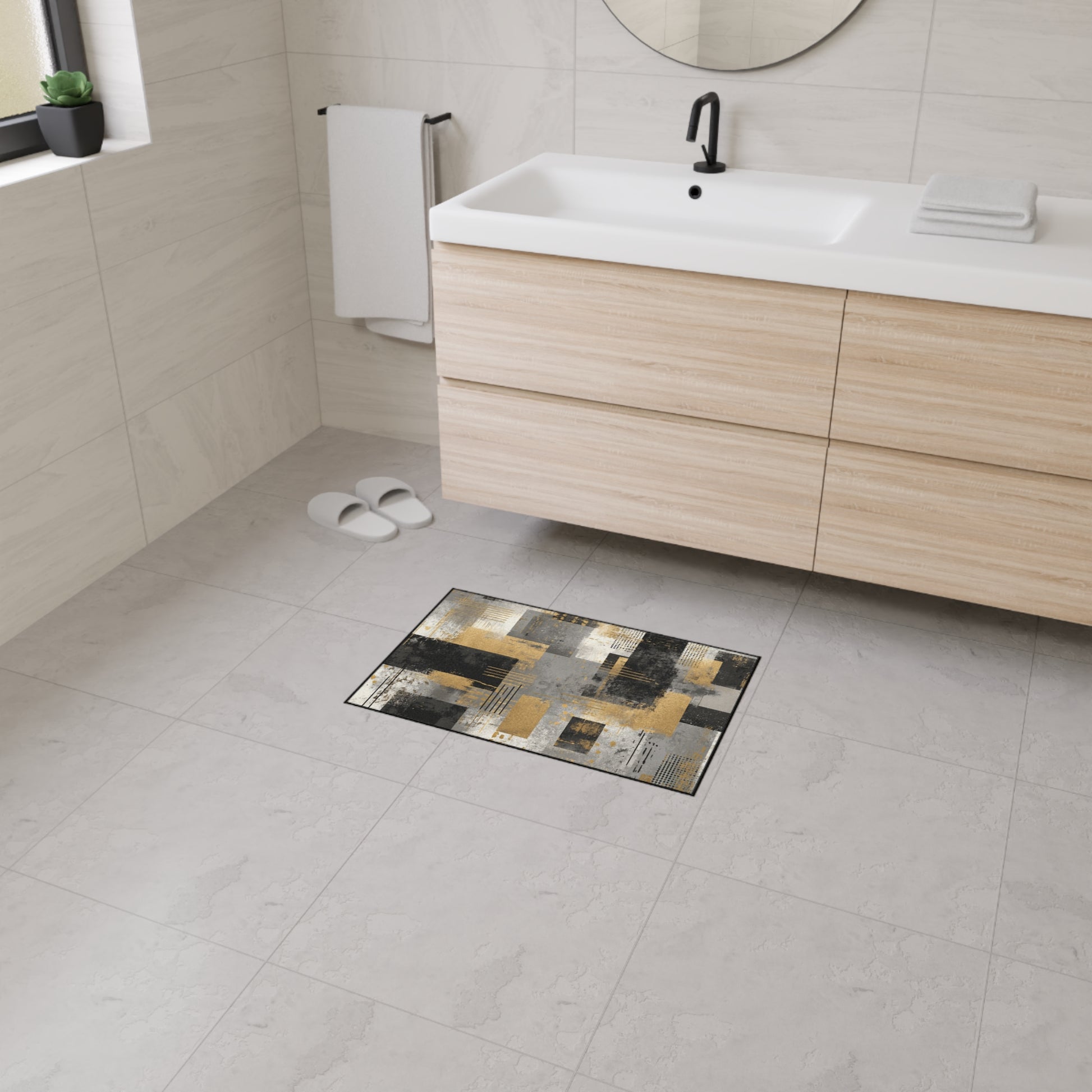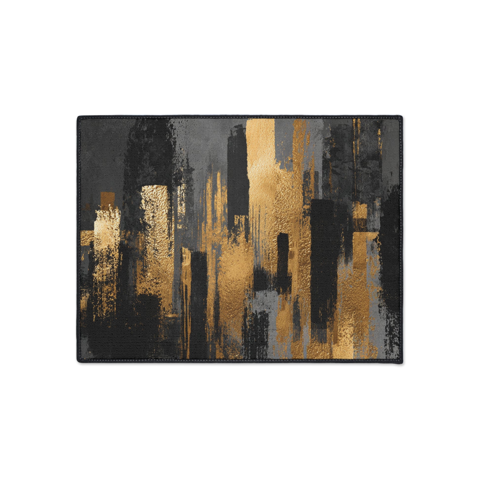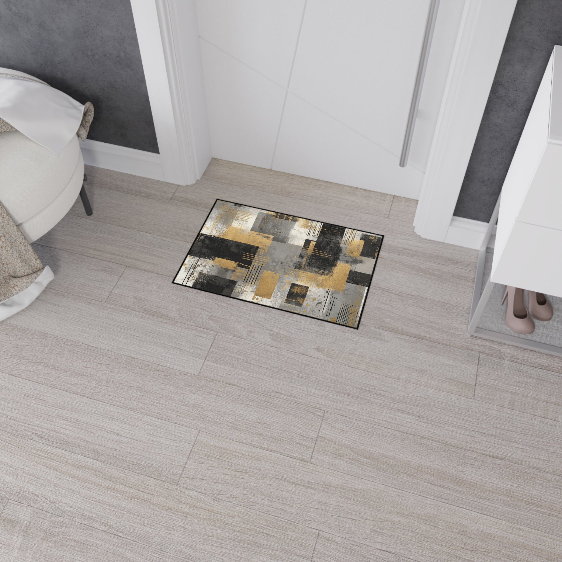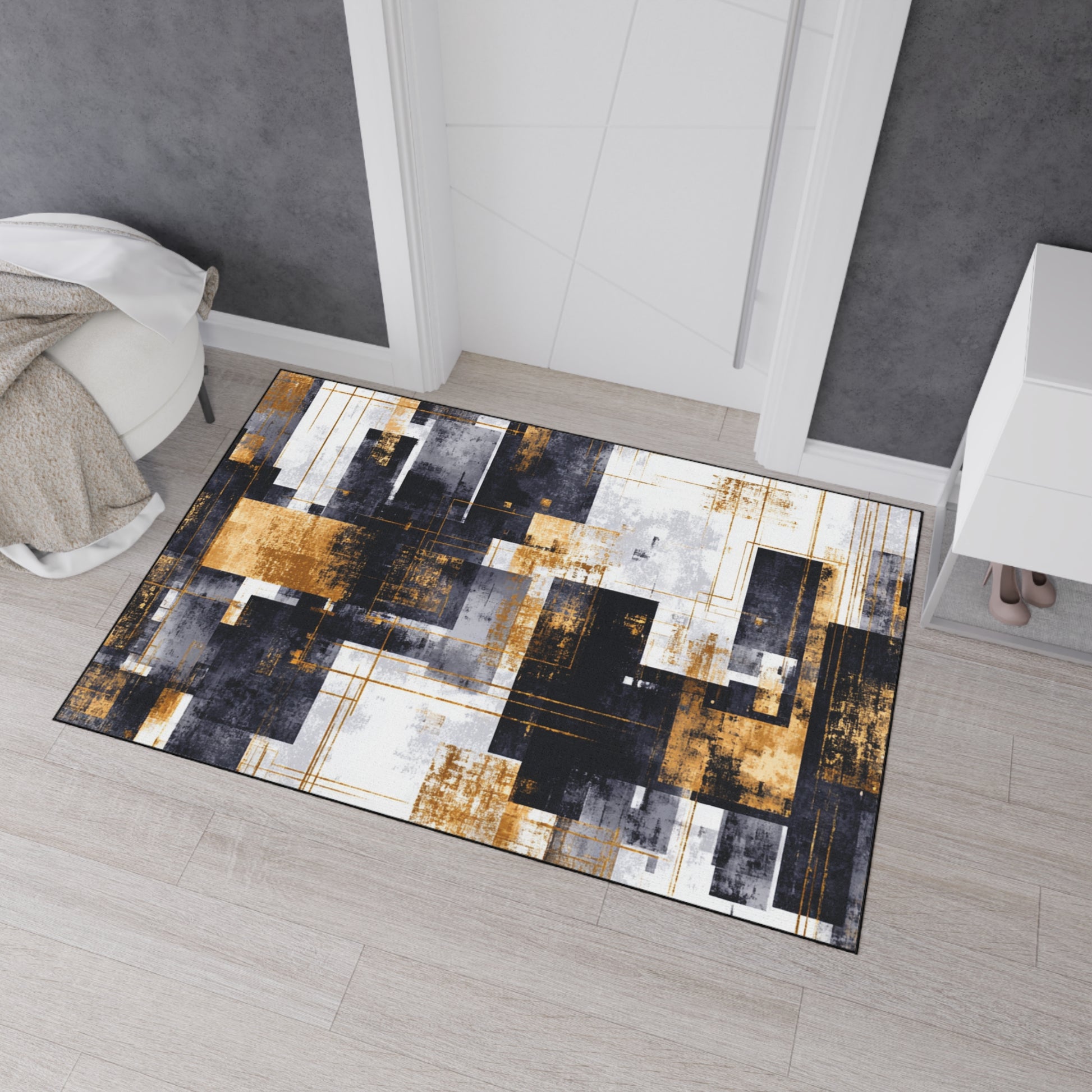 Bring raw, modern energy to your entryway or studio with this heavy-duty floor mat. The abstract grid of muted golds, deep charcoals, and weathered grays reads like urban architecture—balanced, textured, and quietly bold. Underfoot it feels sturdy and dependable: a rugged polyester surface holds vibrant inks that resist fading, while the non-slip rubber backing keeps the mat planted during busy comings and goings. It’s the kind of piece that anchors a room without shouting—great for creative workspaces, high-traffic hallways, or a polished landing by the door. The black edge gives a finished, gallery-like look that pairs effortlessly with industrial, modern, or eclectic interiors.