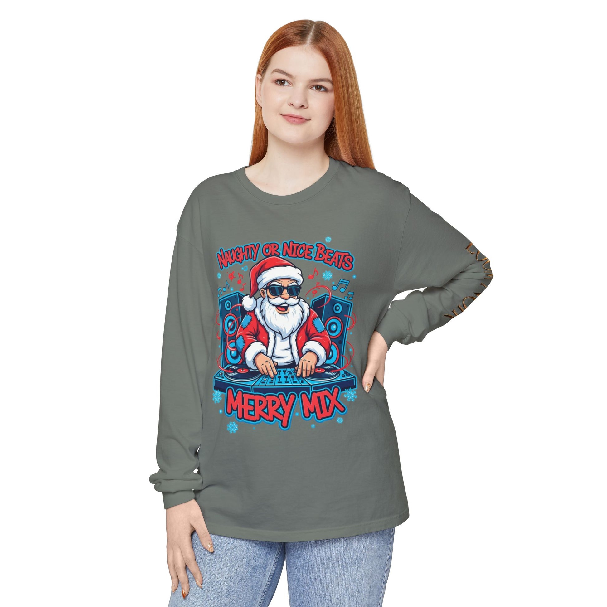 Get in the holiday spirit with this Christmas DJ Santa Long Sleeve Tee featuring a "Naughty or Nice Beats" Merry Mix design. Perfect for anyone looking to add some festive fun to their wardrobe this holiday season. Great for Christmas parties, casual wear, and music lovers.