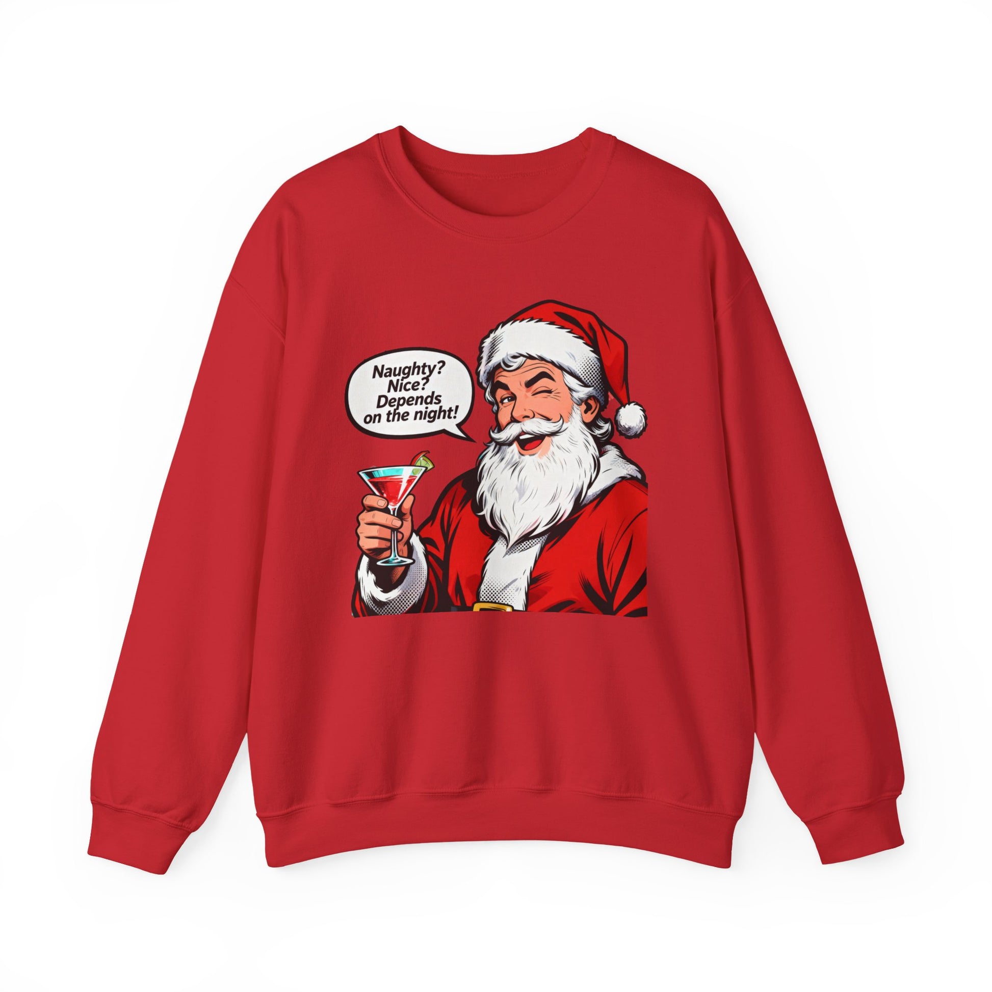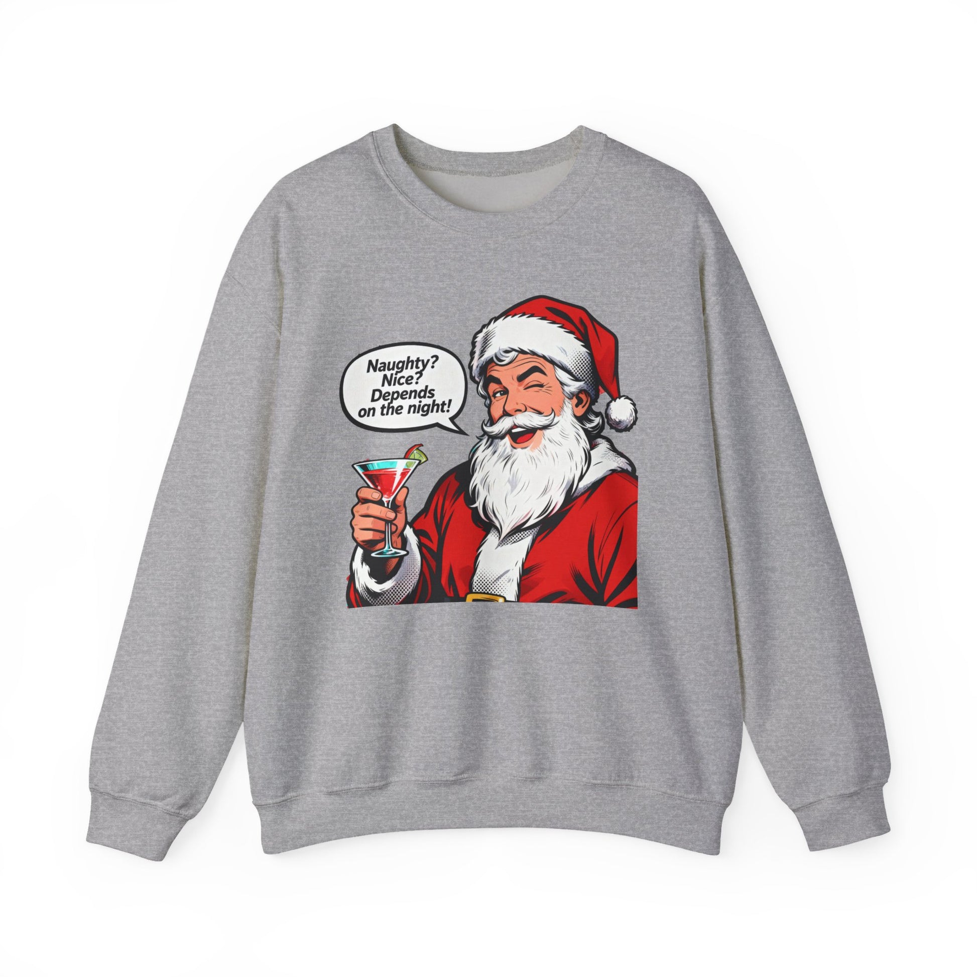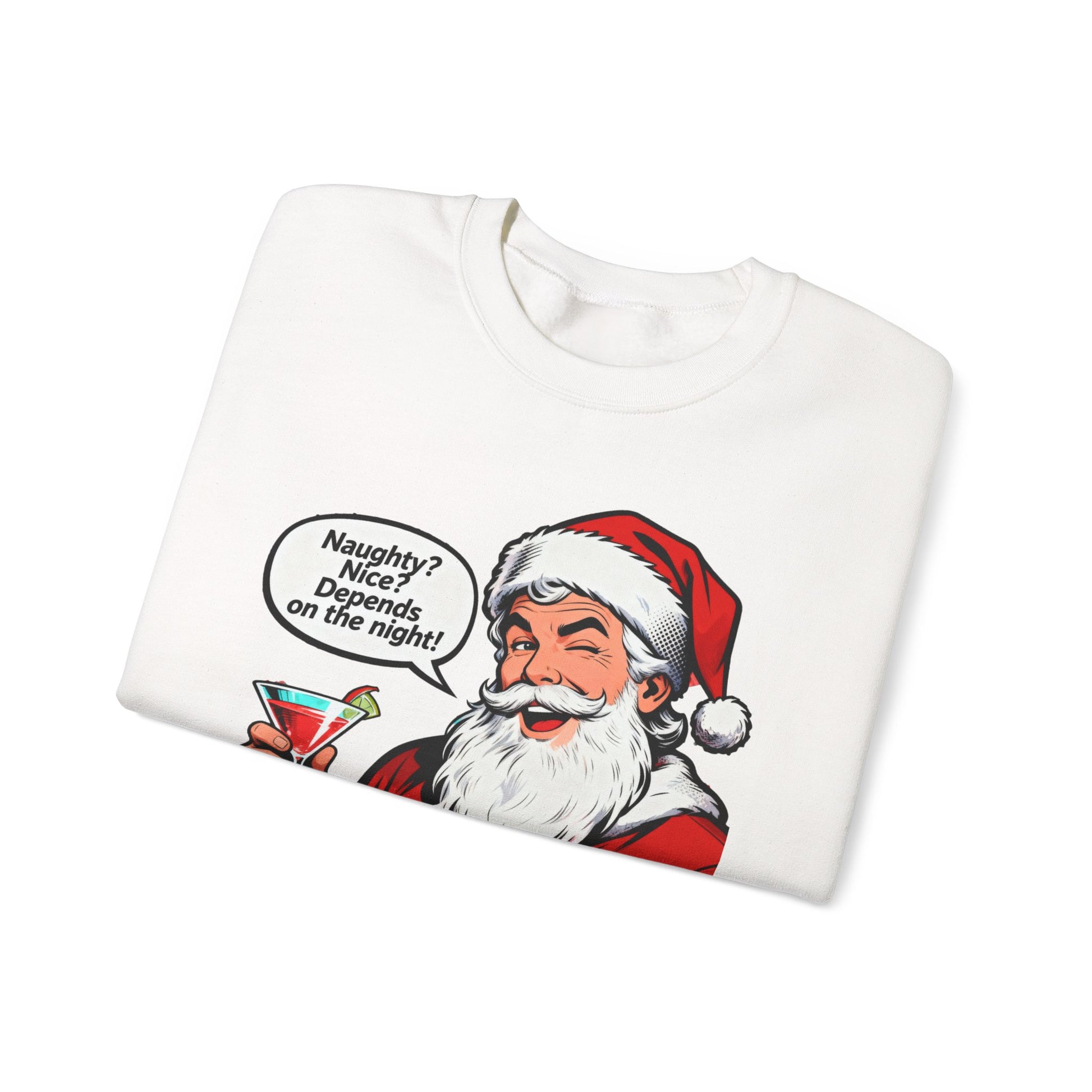 This sturdy crewneck sweatshirt brings a wink of retro holiday humor to quiet nights by the fire and loud, laughter-filled gatherings. The front shows a vintage-style Santa raising a cocktail with a speech bubble that reads, “Naughty? Nice? Depends on the night.” The softened 50/50 cotton-poly fabric and classic fit make it cozy for slow mornings with coffee, caroling runs, or layering under a winter coat for evening walks. Subtle details — ribbed collar, cuffs, and waistband with double-needle stitching — keep the silhouette clean while holding up through many seasons. The muted white color lets the bold, pop-art illustration stand out without shouting. Wear it when you want seasonal warmth and a sly grin, whether you’re trimming the tree, hosting friends, or just lounging with a movie and hot toddy.