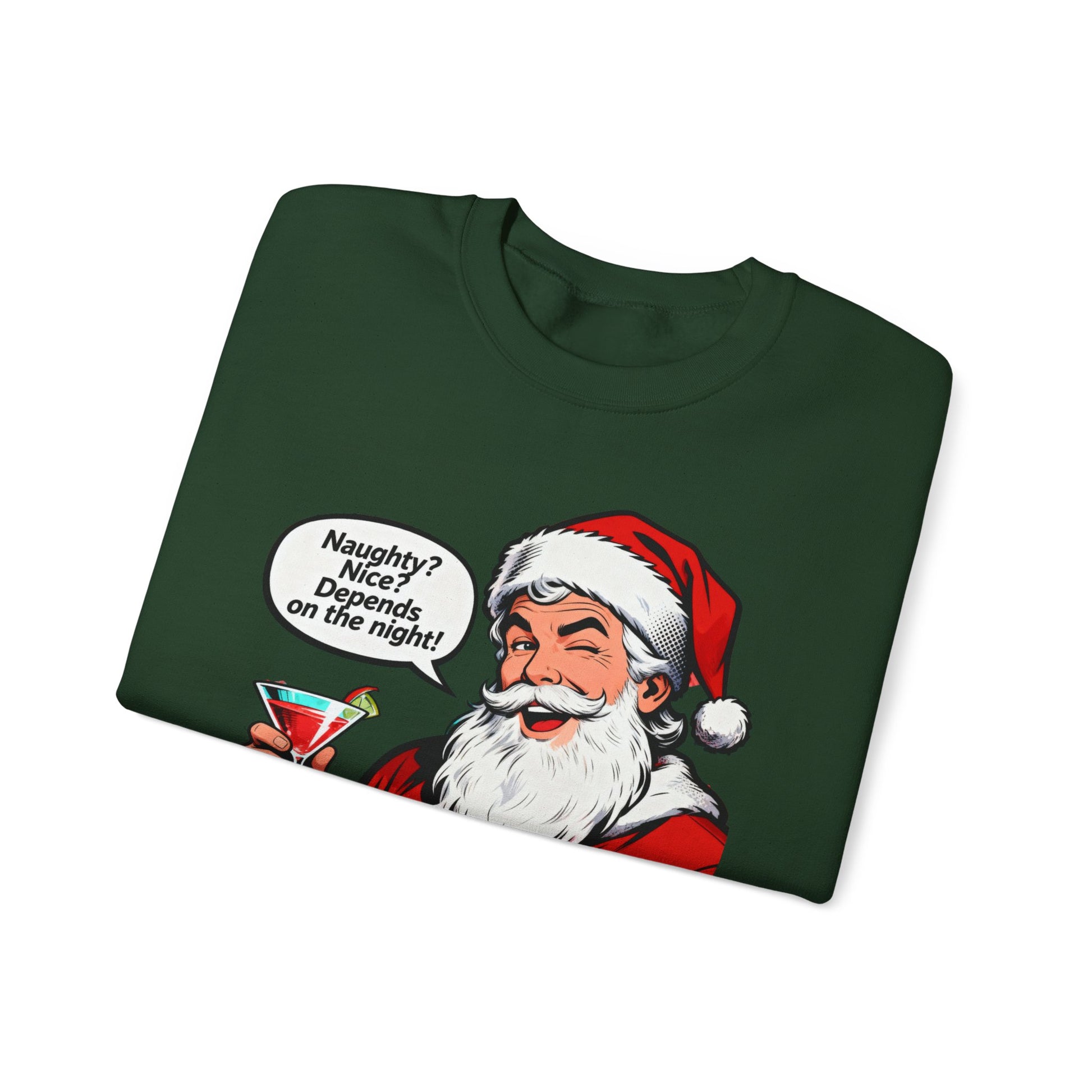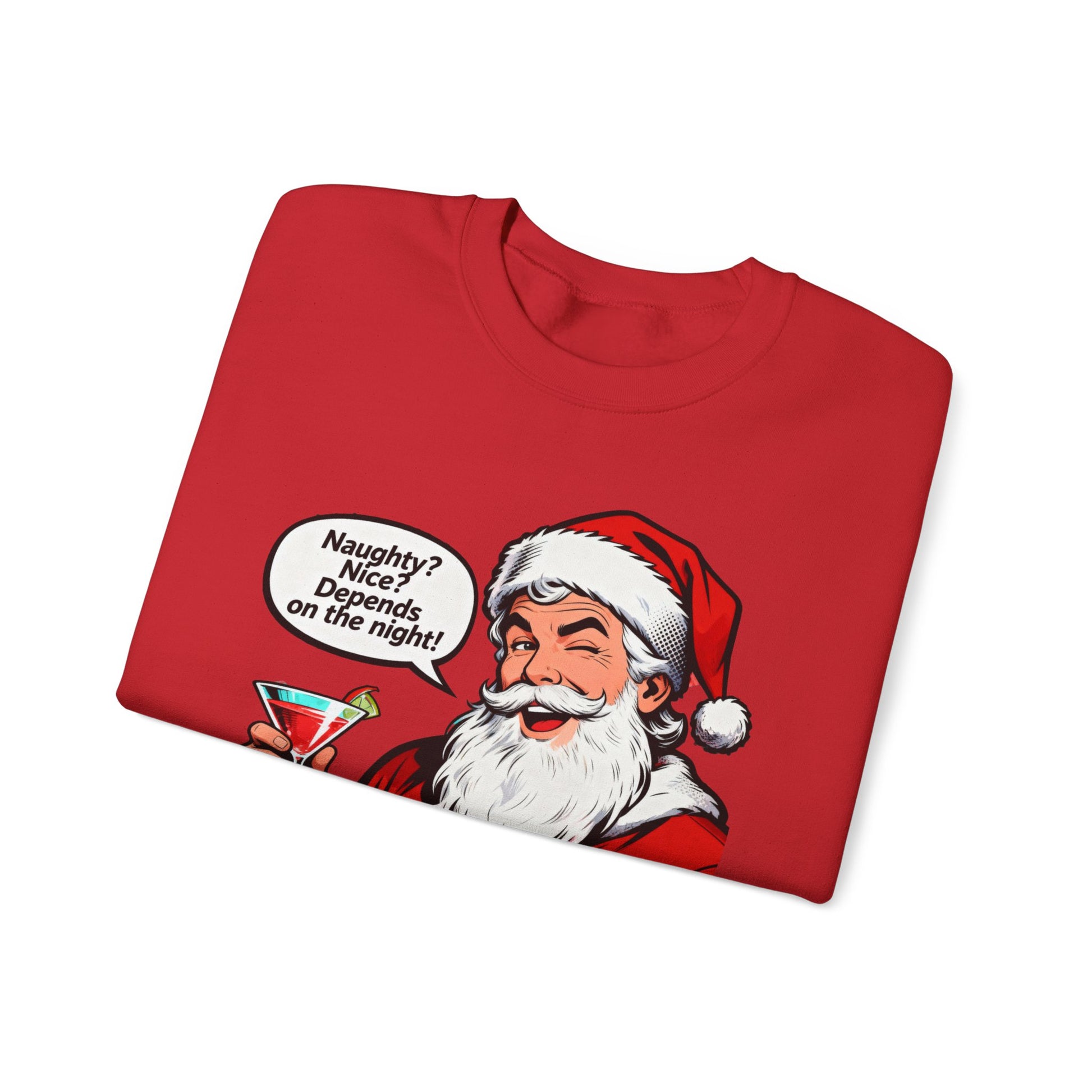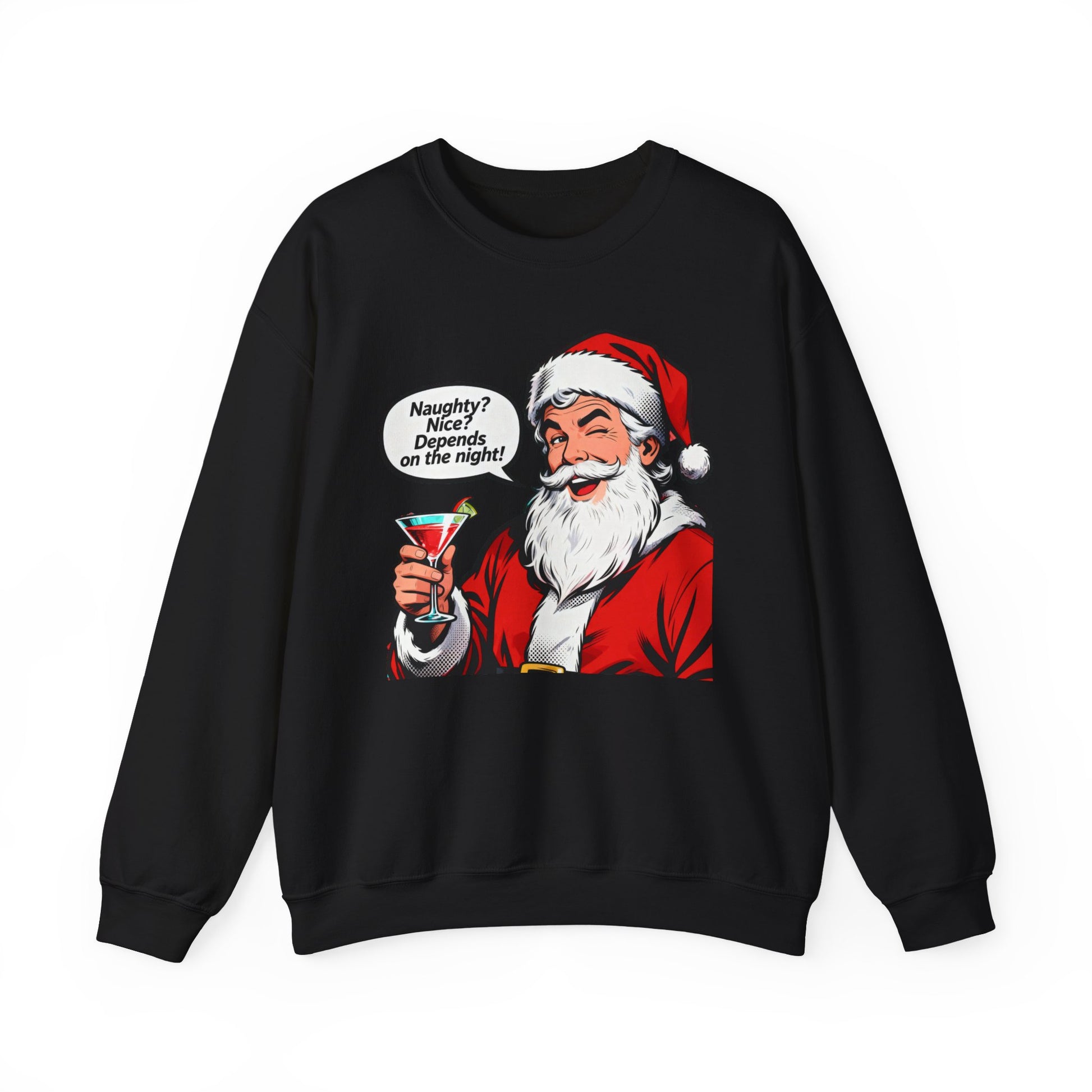 This sturdy crewneck sweatshirt brings a wink of retro holiday humor to quiet nights by the fire and loud, laughter-filled gatherings. The front shows a vintage-style Santa raising a cocktail with a speech bubble that reads, “Naughty? Nice? Depends on the night.” The softened 50/50 cotton-poly fabric and classic fit make it cozy for slow mornings with coffee, caroling runs, or layering under a winter coat for evening walks. Subtle details — ribbed collar, cuffs, and waistband with double-needle stitching — keep the silhouette clean while holding up through many seasons. The muted white color lets the bold, pop-art illustration stand out without shouting. Wear it when you want seasonal warmth and a sly grin, whether you’re trimming the tree, hosting friends, or just lounging with a movie and hot toddy.