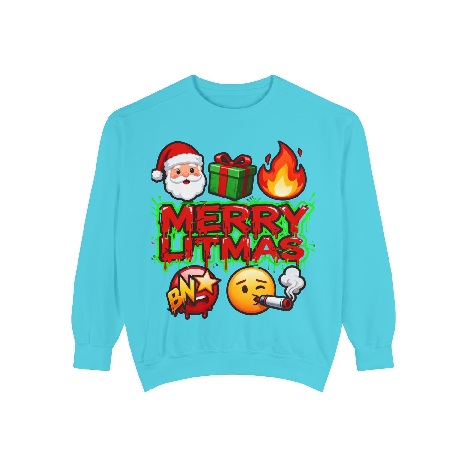 This relaxed garment-dyed sweatshirt brings playful, street-style energy to holiday dressing. Bold, colorful emoji-style graphics — a Santa, gift, flame, and cheeky smoking face — cluster around a graffiti-like “MERRY LITMAS” headline, creating a tongue-in-cheek take on seasonal cheer. The medium-heavy ring-spun cotton blend feels substantial and soft, while ribbed collar, cuffs, and hem keep the shape after wear. Subtle back neck detailing and sewn-in twill label add thoughtful construction touches. Wear it layered over a tee or under a jacket during casual winter nights when you want to stand out and share a wink of irreverent holiday spirit.