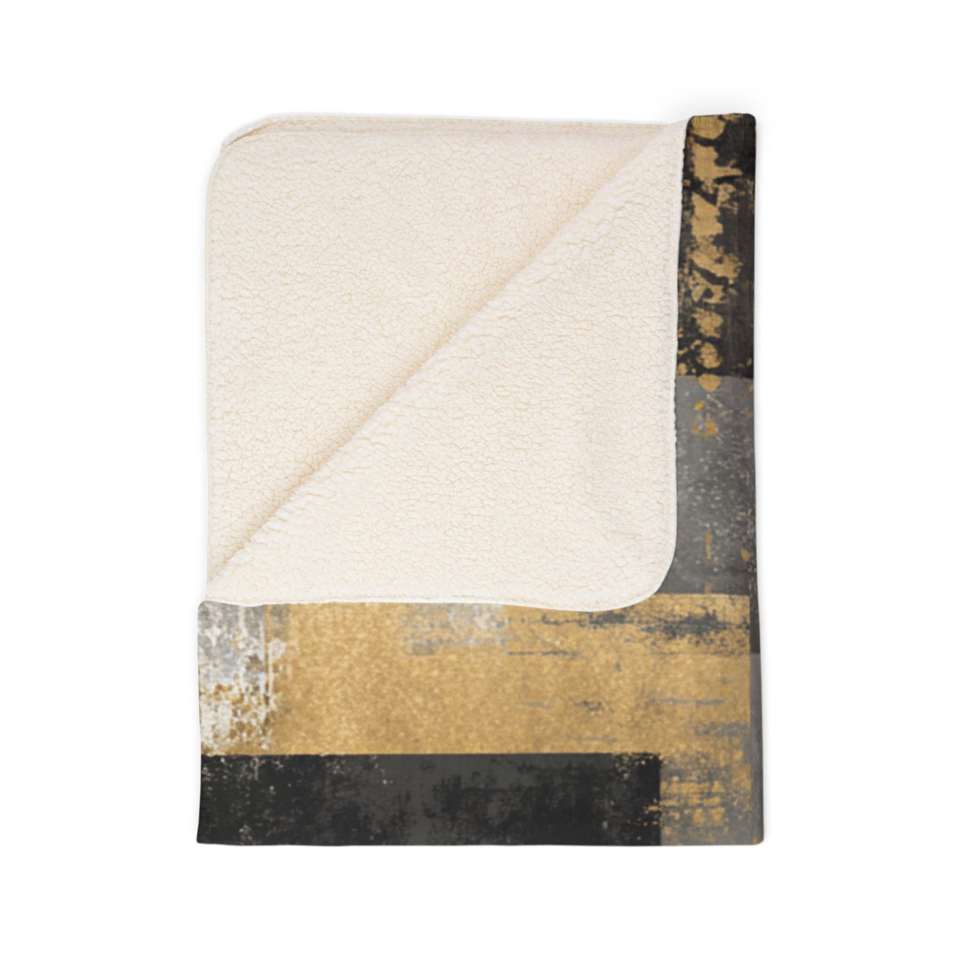 A plush sherpa blanket that feels like an instant room upgrade. The design blends charcoal, pewter, and warm gold in an abstract, layered pattern — modern yet lived-in. Slip it over a sofa or wrap it around your shoulders on a cool evening; the thick, double-sided polyester pile holds heat and keeps its loft wash after wash. Hemmed edges and matched seam thread keep the look refined. It sits comfortably in a minimalist living room, a downtown loft, or a cozy reading nook, adding subtle metallic warmth without shouting for attention.