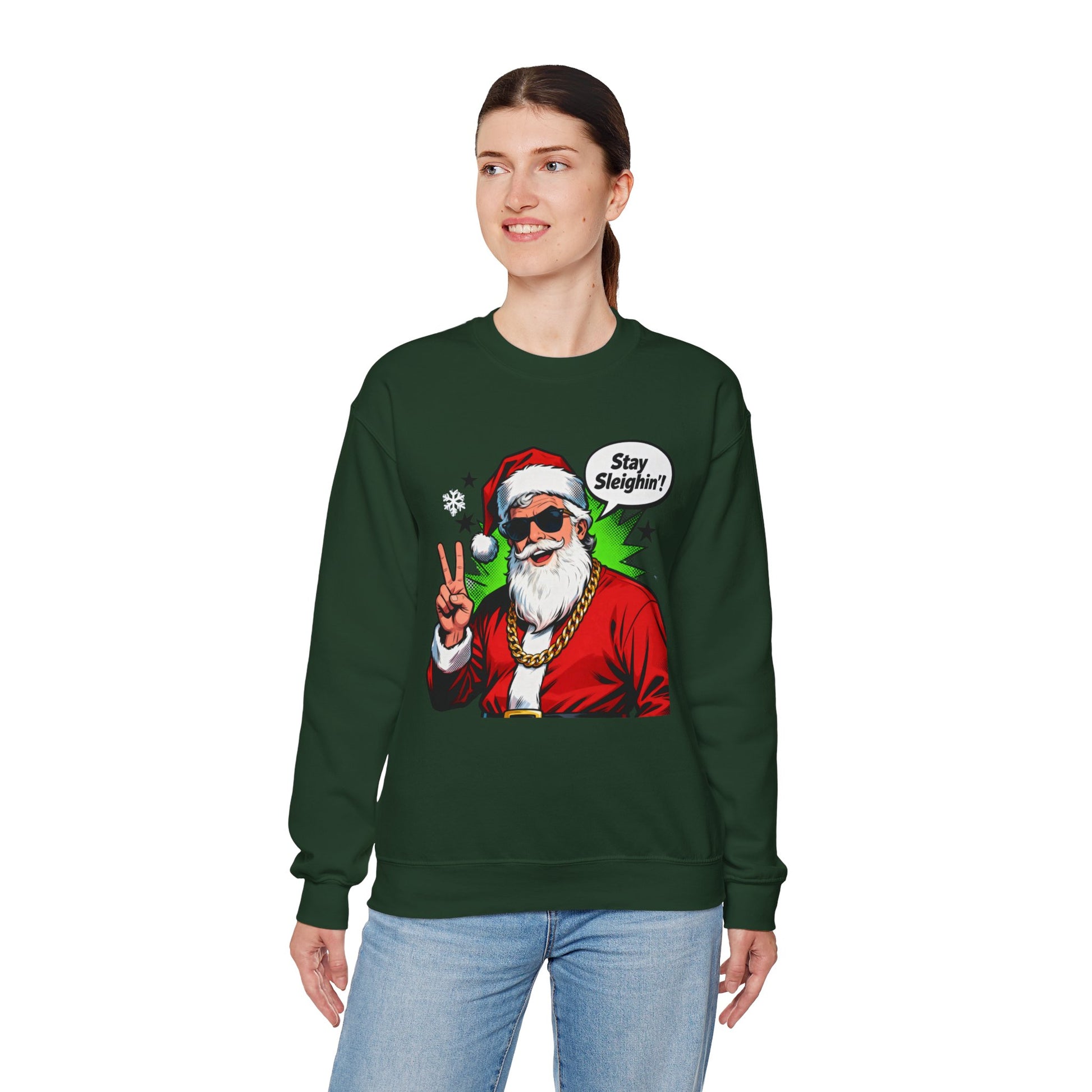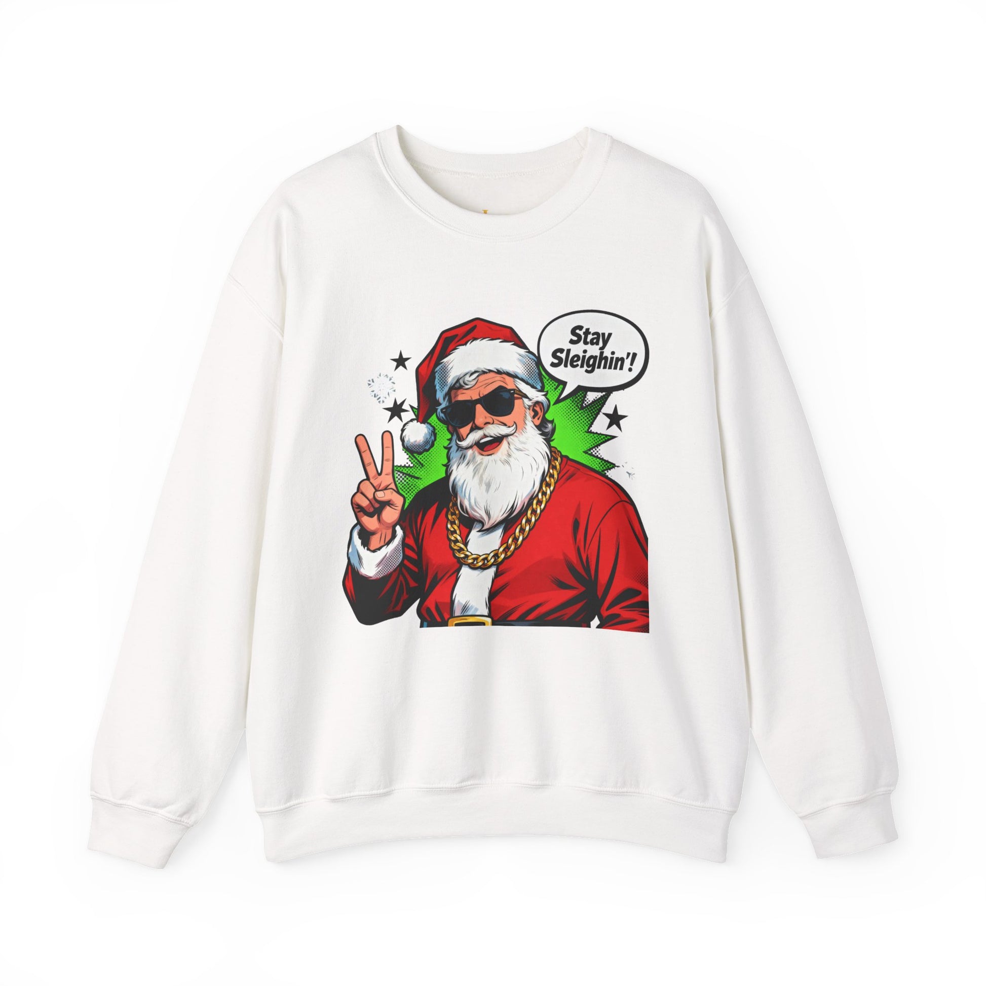 This cozy crewneck brings a playful, modern twist to holiday dressing. Soft, midweight fleece drapes comfortably while a bold, retro-styled Santa graphic—complete with shades, chain, and a cheeky “Stay Sleighin’” speech bubble—adds personality without being over the top. Wear it on chilly mornings while wrapping gifts, at casual holiday parties, or bundled up for a nighttime walk to see neighborhood lights. The clean white background makes the artwork pop and pairs easily with jeans, joggers, or leggings for an effortless, festive look.